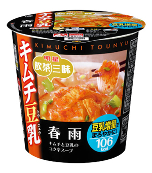 오는 22일에 발매예정인 이 식품은 ‘식차삼미 봄비 김치두유’(飲茶三昧 春雨 キムチ豆乳)라는 이름의 즉석 컵수프로 김치의 새콤하고도 매콤한 맛과 풍부한 영양을 즐길 수 있다.