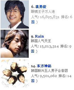 그 중 최고의 한류스타 배용준이 1689만표를 획득하며 6위를 차지해 한국 스타 중 최고의 성적을 거두고 있으며 1521만표를 차지한 비가 9위에 올랐다.