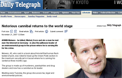 영국의 데일리텔레그래프는 21일 “세계에서 가장 악명높은 살해범 아민 마이베스(Armin Meiwes·45)가 채식주의자로 변신해 감옥 내 녹색당 최고위원으로 뽑혔다.”고 인터넷판에 전했다.