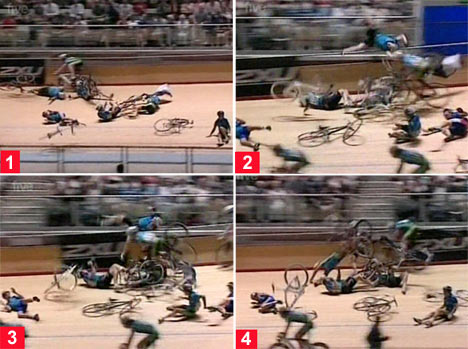 빠른 속도로 달려오다 갑자기 멈춘 선수들은 사이클에서 튕겨나가 공중으로 내동댕이 쳐졌으며 이미 바닥에 굴러 떨어진 선수들은 다음 선수들과 부딪히지 않도록 몸을 피해야 했다.