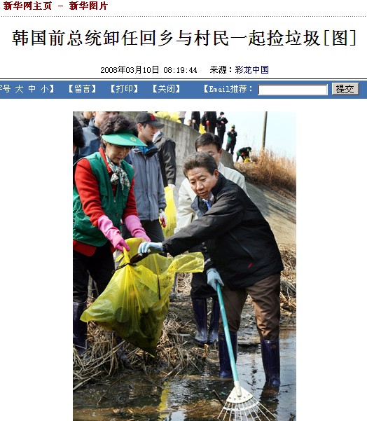 노무현 전 대통령이 직접 봉하마을 청소에 나선 것에 대해 중국 언론이 “매우 보기 드문 모습”이라며 관심을 보이고 있다.