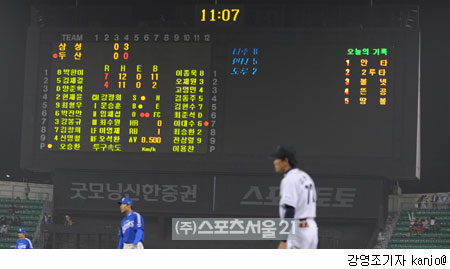 두산은 홈인 잠실구장에서 35승 28패를 기록했다. 5할 승률을 넘었지만 시즌 70승 56패와 비교하면 홈 성적과 큰 차이가 나지 않는다. 두산은 올시즌 대구구장에서 4승5패.잠실에서도 똑같이 4승5패를 기록했다. 언뜻 구장의 차이는 없는듯하다. 그렇지만 예년 성적까지 비교하면 대구구장에선 별 재미를 못 봤고 편안한 홈에선 재미를 봤다.