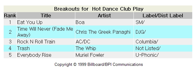 한국 가수 최초로 미국 메인 스트림에 진출한 BoA(보아)의 미국 데뷔곡 ‘Eat You Up’이 지난 6일(미국 현지시간) 발표된 미국 빌보드 핫 댄스 클럽 플레이 차트 Breakout 부문에서 1위를 차지했다.