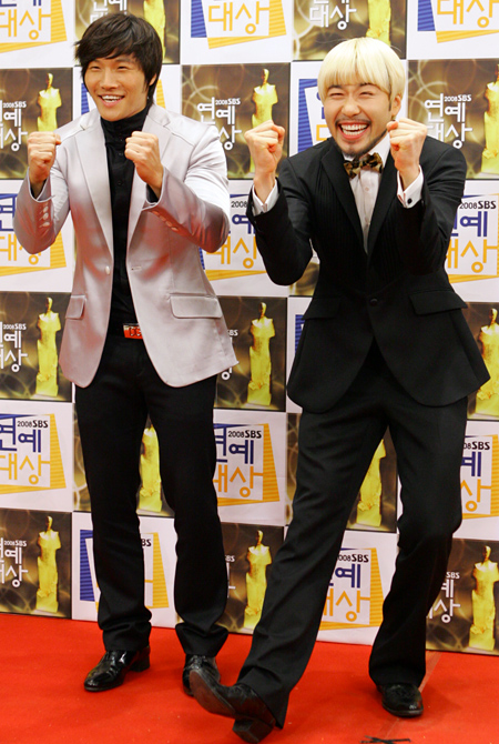 노홍철ㆍ김종국이 30일 오후 서울 등촌동 SBS 공개홀에서 진행된 ‘2008 SBS연예대상’에 참석해 포토월에서 멋진 포즈를 취하고 있다.