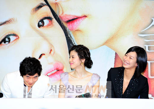 이날 기자간담회 중 출연배우 권상우, 이보영, 정애연이 환하게 웃고있다.