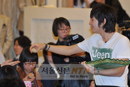 29일 오전 11시 서울 중구 라루체 아이리스홀에서 열린 ‘근석이랑 놀자’의 팬미팅에 참석한 장근석이 팬들에게 자신이 만든 주먹밥을 팬들에게 나눠주고 있다.