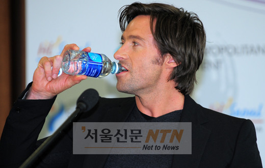 영화 ‘엑스맨’ 시리즈로 인기를 끌고 있는 할리우드 배우 휴 잭맨(41)이 10일 오후 서울 시청 서소문별관에서 열린 ‘서울특별시 홍보대사 위촉식’에서 홍보대사로 위촉된 가운데 긴장한 나머지 물을 마시고 있다.