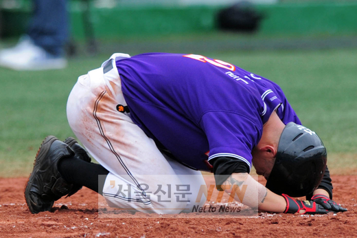 13일 오후 서울 목동야구장에서 열린 KBS ‘천하무적 토요일-천하무적 야구단’ 공개현장에서 가수 이하늘이 히어로즈 김시진 감독에게 큰절을 하고 있다.