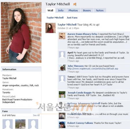 캐나다 10대 싱어송라이터 테일러 미첼(Taylor Mitchell·19)의 사망 소식을 접한 네티즌의 추모글들이 속속 이어지고 있다.