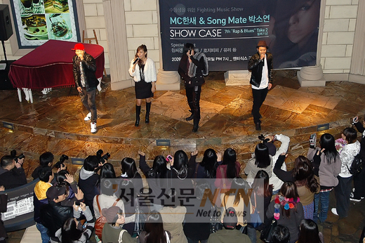 13일 오후 7시 서울 성동구 왕십리 엔터식스에서 열린 ‘MC한새 & Song Mate 박소연의 쇼케이스’ 현장에 MC한새와 박소연, 지기독이 합동 공연을 하고 있다.