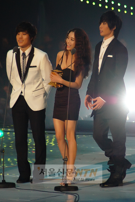 21일 오후 서울 잠실 실내체육관에서 열린 ‘2009 엠넷 아시안 뮤직어워드’ (Mnet 2009 Mnet Asian Music Awards, 이하 MAMA)에 그룹 에이트(이현, 백찬, 주희)가 혼성가수상을 수상하고 있다.