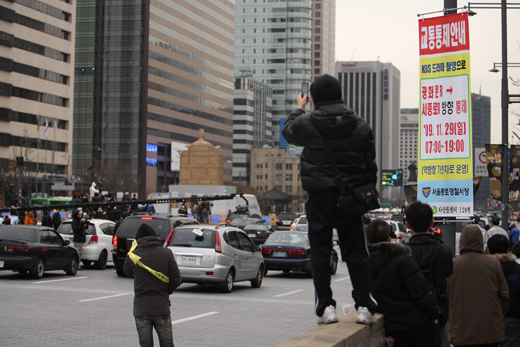 29일 오전 서울 광화문 광장 도로가 통제된 가운데 KBS 2TV 드라마 ‘아이리스’ 촬영이 진행되고 있다.