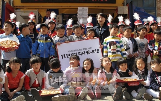 SK 텔레콤 오픈마켓 11번가는 스승의 날을 맞아 14일 오전 인천 명현초등학교에서 피자 100판을 즉석에서 전달하는 ‘11번가가 피자 쏩니다’ 이색 파티를 실시했다.