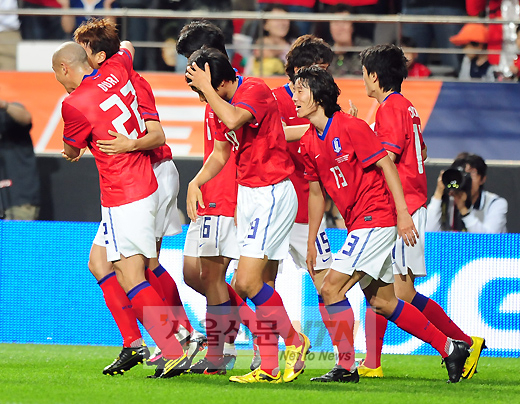 [서울신문NTN 한윤종 기자] 2010 남아공월드컵 본선을 앞둔 허정무 감독이 이끄는 한국 축구 대표팀이 16일 저녁 서울 월드컵경기장에서 남미 강호 에콰도르와 평가전에서 이승렬이 선제골을 넣고 동료선수들과 기뻐하고 있다.