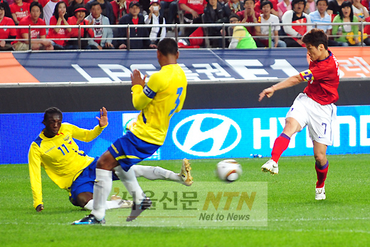 [서울신문NTN 한윤종 기자] 2010 남아공월드컵 본선을 앞둔 허정무 감독이 이끄는 한국 축구 대표팀이 16일 저녁 서울 월드컵경기장에서 남미 강호 에콰도르와 평가전에서 박지성 선수가 슈팅을 날리고 있다.
