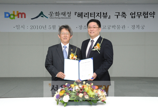 다음커뮤니케이션(이하 다음)은 17일 오전 국립고궁박물관에서 이건무 문화재청장(사진 좌측)과 최세훈 다음 대표(사진 우측)가 참석한 가운데 ‘헤리티지뷰(Heritage View)’ 구축을 위한 협약을 맺었다.