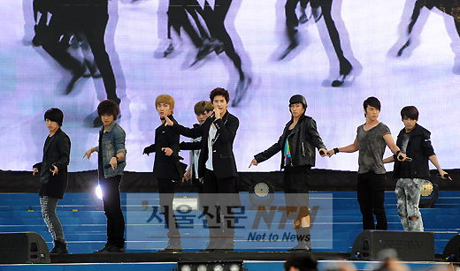 [서울신문NTN 한윤종 기자] 19일 오후 서울 여의도광장 특설무대에서 열린 2010 대구국제육상경기대회 세계최초 3D KBS 생방송 축하공연에 참석한 가수 슈퍼주니어가 축하공연을 하고 있다.