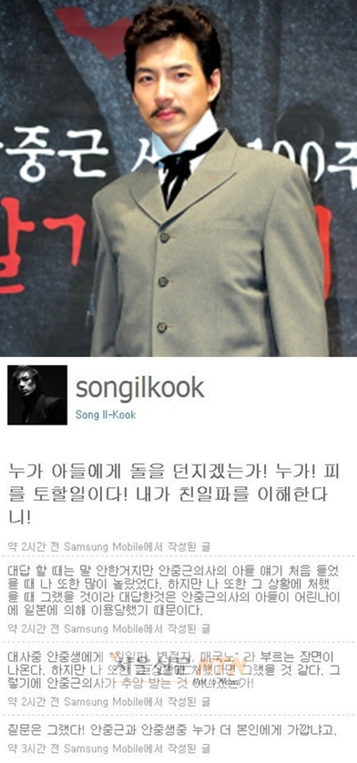 송일국은 트위터에 쓴 글에서 “누가 아들에게 돌을 던지겠는가! 누가! 피를 토할 일이다! 내가 친일파를 이해한다니!”라고 다소 격앙된 어조로 논란에 대해 해명했다.