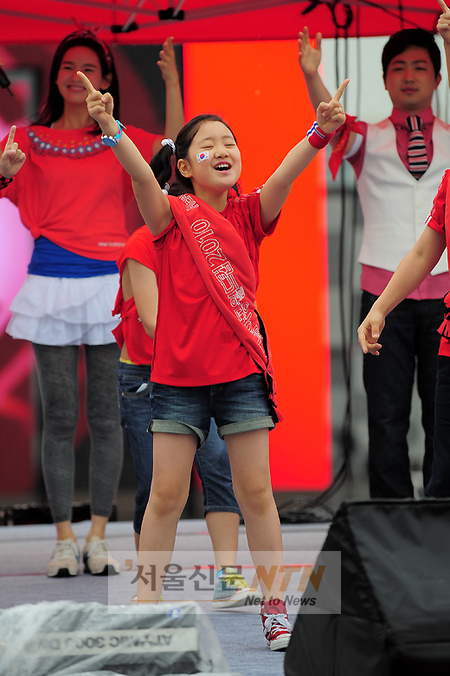 [서울신문NTN 이대선 기자] 12일 오후 서울 한강시민공원 반포지구에서 열린 2010 남아공월드컵 한국과 그리스전 거리응원에서 아역배우 진지희가 축하무대를 펼치고 있다.