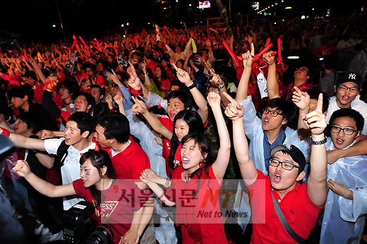[서울신문NTN 현성준 기자] 12일 오후 서울 삼성동 영동대로에서 시민들이 2010 남아공월드컵 한국과 그리스전 거리응원에서 승리를 만끽하고 있다.