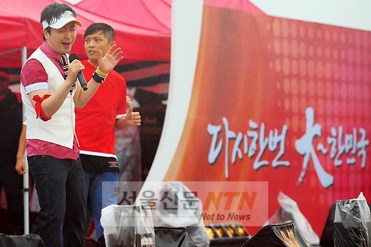 [서울신문NTN 이대선 기자] 12일 오후 서울 한강시민공원 반포지구에서 열린 2010 남아공월드컵 한국과 그리스전 거리응원에서 가수 박현빈이 축하무대를 펼치고 있다.