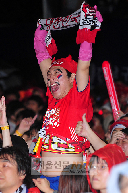 [서울신문NTN 현성준 기자] 12일 오후 서울 삼성동 영동대로에서 시민들이 2010 남아공월드컵 한국과 그리스전 거리응원에서 환호하고 있다.