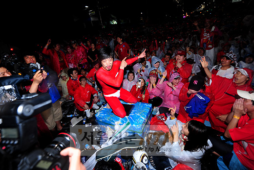 [서울신문NTN 현성준 기자] 개그맨 정명훈이 12일 오후 서울 삼성동 영동대로에서 2010 남아공월드컵 한국과 그리스전 거리응원에서 퍼포먼스를 펼치고 있다.