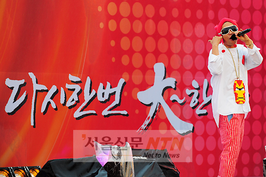 [서울신문NTN 이대선 기자] 12일 오후 서울 한강시민공원 반포지구에서 열린 2010 남아공월드컵 한국과 그리스전 거리응원에서 가수 MC몽이 축하무대를 펼치고 있다.