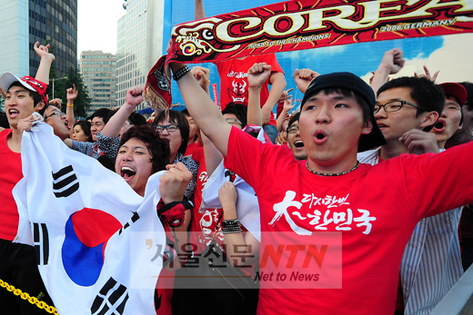 [서울신문NTN 이대선 기자] 23일 오전 2010 남아공월드컵 대한민국과 나이지리아 축구 국가대표팀의 경기가 펼쳐진 서울광장 거리응원 현장에서 대한민국 축구 대표팀이 원정 첫 16강 진출을 확정 짓자 시민들이 환호하고 있다.