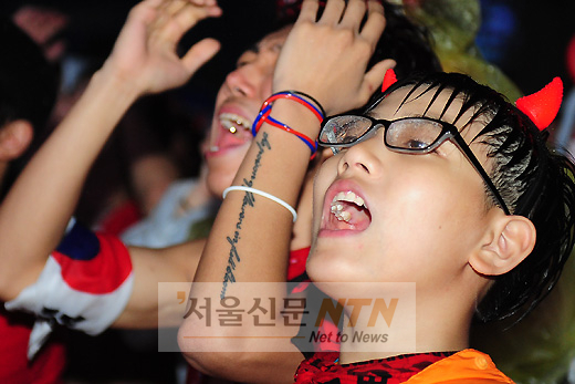 [서울신문NTN 이대선 기자] 대한민국과 우르과이 축구 국가대표팀의 16강 경기가 펼쳐진 26일 오후 서울 태평로 서울광장 거리응원전에서 시민들이 이동국의 찬스가 득점으로 연결되지 못하자 시민들이 안타까워 하고 있다.