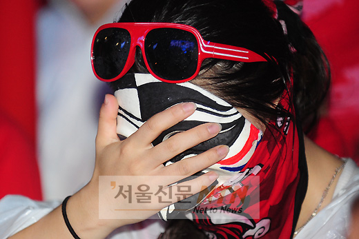 [서울신문NTN 이대선 기자] 대한민국과 우르과이 축구 국가대표팀의 16강 경기가 펼쳐진 26일 오후 서울 태평로 서울광장 거리응원전에서 우르과이가 첫 득점을 하자 한 시민이 안타까워 하고 있다.