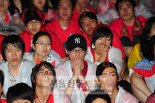 [서울신문NTN 이대선 기자] 대한민국과 우르과이 축구 국가대표팀의 16강 경기가 펼쳐진 26일 오후 서울 태평로 서울광장 거리응원전에서 시민들이 경기를 관전하고 있다.