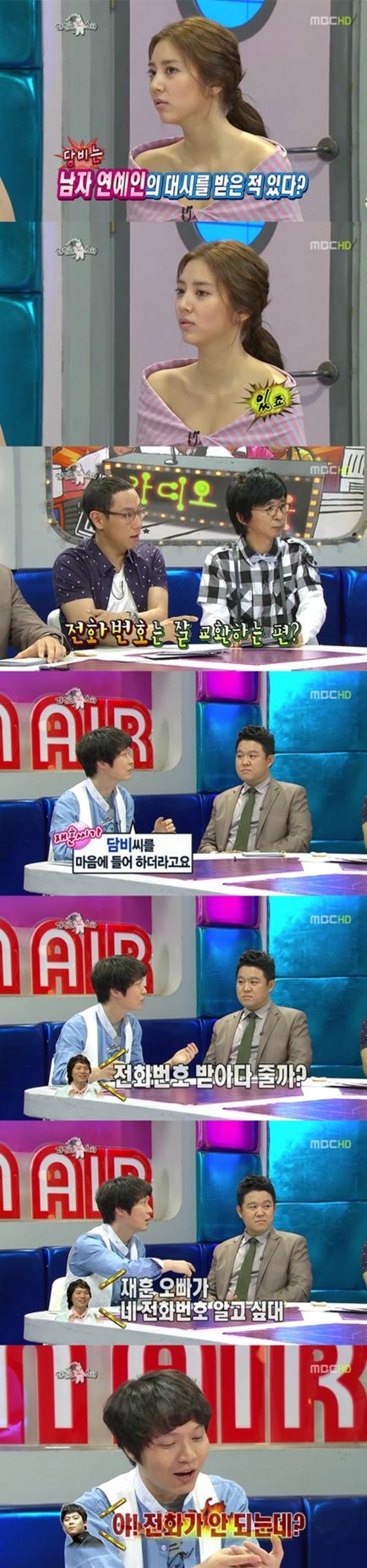 이날 손담비는 “남자 연예인에게 대시를 받은 적이 있나?”라는 MC의 질문에 긍정했다. 이어 전화번호 교환을 잘하는 편인가라는 물음엔 “거절을 잘 못한다.”라고 답했고 옆에 있던 신정환이 이재훈에 얽힌 에피소드를 털어놨다.