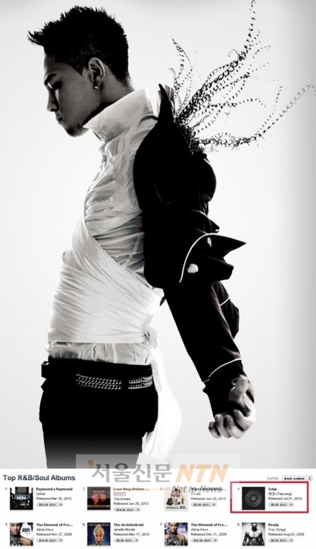 그룹 빅뱅의 태양이 쟁쟁한 팝스타들의 격전장 아이튠즈 알앤비 차트에서 놀랄만한 성적을 거두며 세계의 이목을 끌고 있다.
