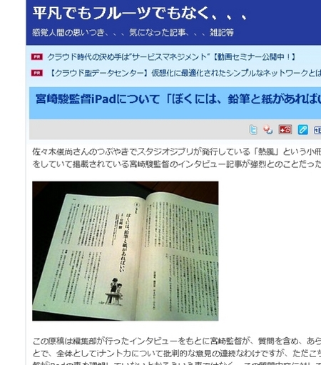 이에 앞서 일본 IT 종합포털 사이트 IT미디어는 지난 11일 스튜디오 지브리가 발행하는 소책자 ‘열풍’에 실린 “내게는 연필과 종이만 있으면 좋겠다” 인터뷰 특집에서 미야자키 하야오 감독이 아이패드와 그를 사용하는 이들을 공개적으로 비판하는 내용을 소개했다.