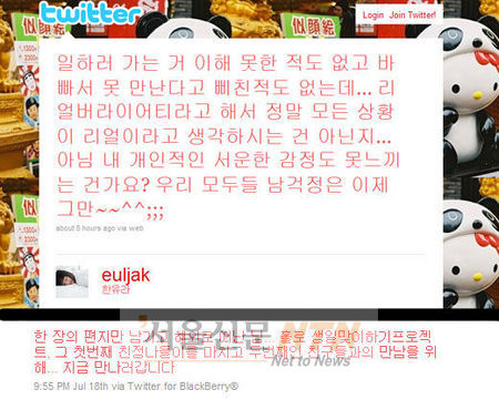 이에 한유라는 21일 자신의 트위터를 통해 “일하러 가는 거 이해 못한 적도 없고 바빠서 못 만난다고 삐진 적도 없는데... 리얼버라이어티라고 해서 정말 모든 상황이 리얼이라고 생각하시는 건 아닌지... 아님 내 개인적인 서운한 감정도 못느끼는 건가요? 우리 모두들 남 걱정은 이제 그만~~^^;;;”이라고 글을 게재해 과도한 관심에 대한 부담감을 드러냈다.