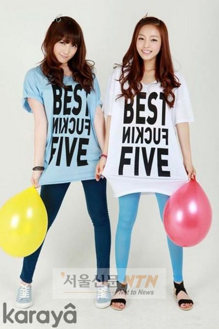카라 멤버 구하라와 강지영은 쇼핑몰 사진 속에서 ‘BEST F**KIN FIVE’라고 적힌 티셔츠를 입은 채 포즈를 취하고 있다. ‘F**KIN’은 성교를 뜻하는 단어로 전 세계에서 통용되는 욕설이다. 현재 이 티셔츠는 ‘카라야’에서 1만4000원에 판매되고 있다.