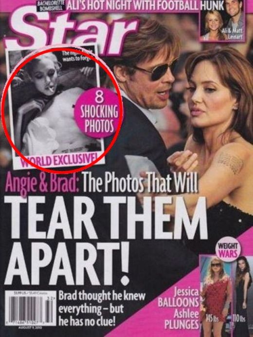 미국의 연예 전문지 ‘스타’는 최근호에서 ‘안젤리나 졸리의 잊고 싶은 밤’(The night Angie wants to forget)이라는 제목으로 8장의 과거사진을 게재했다. 문제의 사진들은 가슴을 노출한 채 마약을 즐기는 것들로 안젤리나 졸리의 옛 친구가 ‘스타’에 넘긴 것으로 알려졌다.