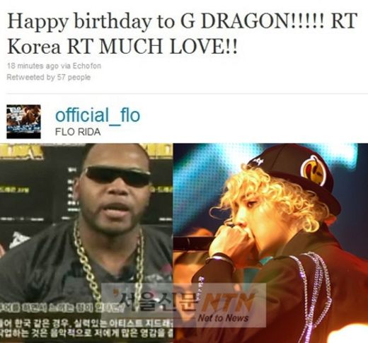 플로라이다는 18일 자신의 트위터에 “생일 축하해, 지드래곤”이라는 짧은 메시지를 남겼다. 23세 생일을 맞은 지드래곤을 위한 축하 인사.