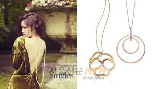 벨벳 슬링백 원피스에 매치한 진주 스트랜드 목걸이는 다양한 스타일링이 가능해서 꾸준한 사랑을 받는 아이템으로 캐주얼 룩에도 개성 있게 연출 할 수 있다. 진주 스트랜드 목걸이에 같이 레이어드한 로즈골드 컬러의 롤리팝 펜던트와 옐로우골드 컬러의 팬지 펜던트도 세련된 여성미를 보여주는 아이템으로 화보 속 손예진을 더욱 빛나게 했다.