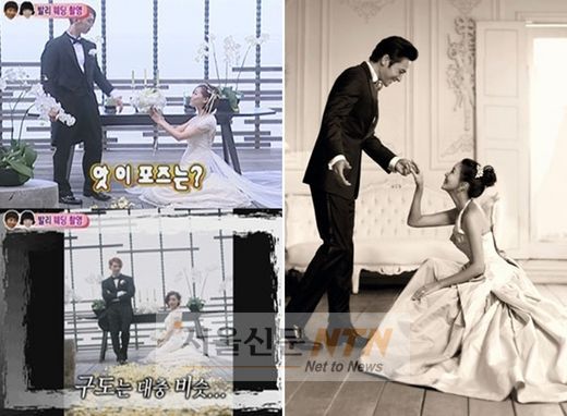 이어 가상 결혼식까지 올린 조권과 가인은 웨딩화보 촬영 중 장동건과 고소영의 웨딩 사진과 유사한 구도의 포즈로 시청자들의 시선을 사로잡았다. 두 사람은 다정하게 고개를 옆으로 기울여 맞대는가 하면, 바닥에 앉은 가인이 조권에게 부케를 건네는 등 익숙한 장면들을 연출했다.