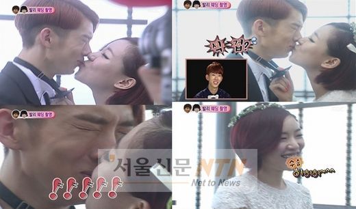 한편 이날 방송에서 조권과 가인은 오랜 염원이었던 키스에 성공해 폭발적인 관심을 모으기도 했다. 평소 가인에게 뽀뽀를 졸라왔던 조권이 과감한 진행에 실패하자 가인은 조권의 보타이를 잡아당기며 기습 키스를 실행했다.