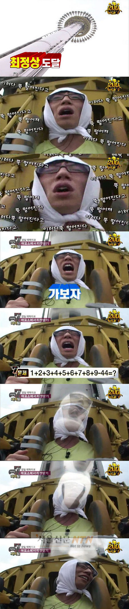 ‘국민 겁쟁이’ 유재석이 놀이기구 자이로드롭 최정상에 올라가 가수 아웃사이더만큼 빠른 말속도를 보였다.