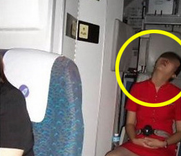 이 사진은 말레이시아 저가 항공사 에어아시아 기내에서 한 승객이 촬영한 것으로, 젊은 여성 승무원이 기내 맨 뒤에 마련된 작은 의자에서 정신없이 곯아 떨어져 있는 모습이 담겼다.