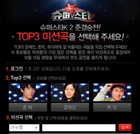 대국민 오디션 프로그램 Mnet ‘슈퍼스타K2’ 본선 5번째 무대에서는 시청자가 직접 TOP3에게 가장 어울리는 곡을 투표, 선정하는 생방송 미션이 진행된다. 이에 10일부터 프로그램 게시판을 통해 TOP3 진출자 장재인, 존박, 허각에게 어울리는 곡을 추천받고 있다.