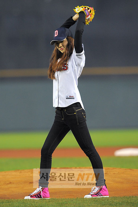 [서울신문NTN 현성준 기자] 미쓰에이 수지가 11일 오후 서울 잠실야구장에서 열린 2010 CJ마구마구 프로야구 플레이오프 4차전 두산과 삼성의 경기에서 시구를 하고 있다.