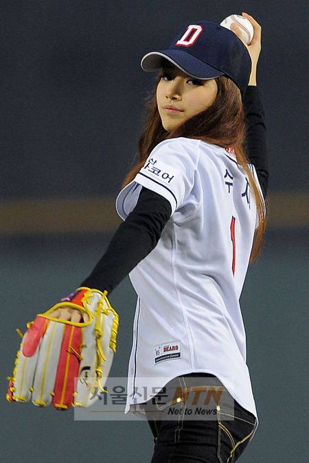 [서울신문NTN 현성준 기자] 미쓰에이 수지가 11일 오후 서울 잠실야구장에서 열린 2010 CJ마구마구 프로야구 플레이오프 4차전 두산과 삼성의 경기에서 시구를 하고 있다.