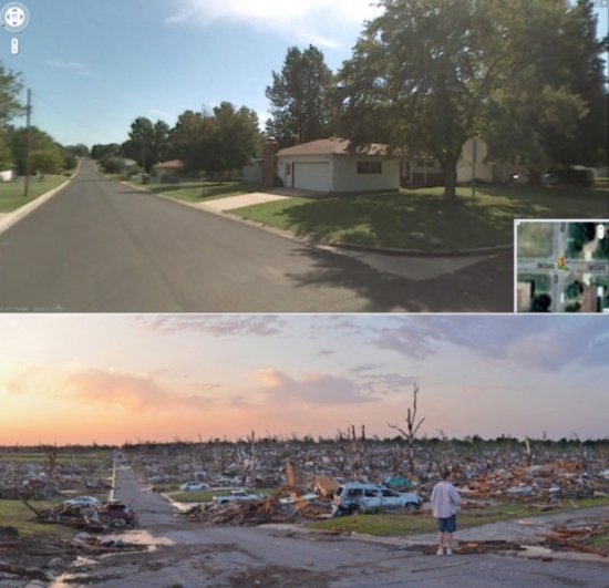 이 사진은 같은 장소를 놓고 토네이도가 일어나기 전 구글 스트리트뷰 사진과 현재 상황을 사진가인 아론 퍼만이 촬영해 비교한 것.