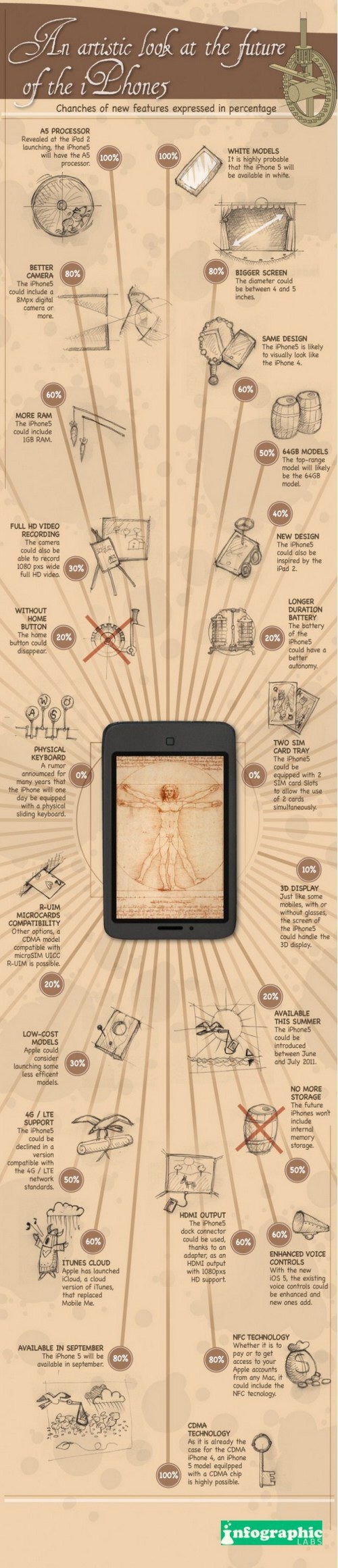 ‘인포그래픽 랩’이라는 사이트가 공개한 이 이미지에는 A5 프로세서 탑재와 DCMA 적용, 확대된 디스플레이 등 다양한 루머가 일목요연하게 정리돼 있고, 항목에 따라 실현 가능성을 퍼센테이지로 기재했다.