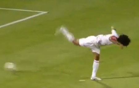 18일 미국 매체 허핑턴포스트 등 외신에 따르면 UAE의 아와나 디아브 선수가 이날 레바논과의 친선 경기에서 발뒤꿈치로 페널티킥을 날려 구설에 올랐다.